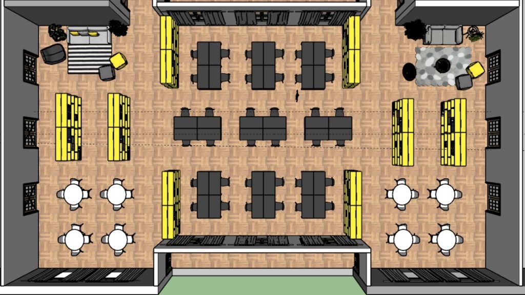 O projeto em questão foi desenvolvido para uma Casa de Estudantes em Curitiba, que tinha como interesse realizar uma reforma para transformar uma sala comum em uma sala de estudos para os seus moradores. Com isso seriam adicionadas várias mesas que precisariam de tomadas próximas para notebooks e uma iluminação adequada para os estudos.